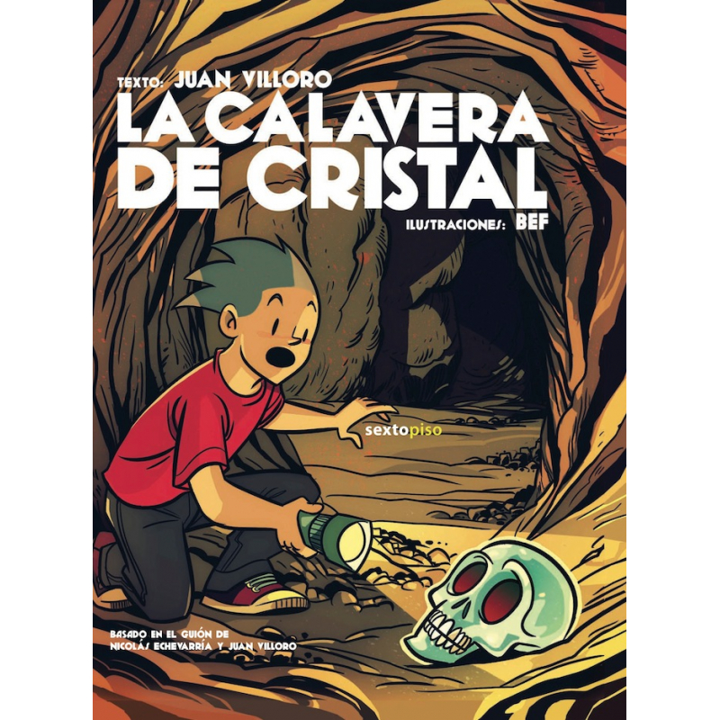 La calavera de cristal es la primera novela gráfica de Juan Villoro. Esta historia, ilustrada con precisión y talento por Bef, apuntala el género del cómic en México y se presenta como una lectura entretenida y entrañable para todas las edades. En el homenaje por el décimo aniversario de la muerte del capitán Rodríguez Plata, su hijo Gus se da cuenta de que la vida de su padre es un misterio para él. De la mano de su amigo Máquina decide aventurarse a resolver los enigmas que rodean el deceso de su padre. En el trayecto se hará de cómplices como su tío Felipe, un científico loco que se refiere a Gus como «pequeño primate», y su fiel asistente, el gordo Bernabé, que es bueno como el pan; contará con la ayuda de Jerónimo «el Reptil» Rodero, quien expía sus pecados viviendo en el desierto donde se alimenta de culebras y armadillos. Juntos deberán combatir a Venus de Venegas, un rico empresario coleccionista de dulces exóticos y de piezas arqueológicas y a su manga de secuaces: la hermosa Circe, que sólo encuentra paz destruyendo obras de arte que rivalizan con su belleza, el conserje del Museo de Antropología Xipe Totec, cuyo apodo deriva del parecido de su horrible rostro con el dios maya de la renovación (el dios despellejado), así como un sacerdote corrupto llamado Mano Santa, y Roberto Bob Boby, campeón regional de tiro y veloz corredor de autos. En medio de esta épica búsqueda a través del pasado, héroes y villanos pasarán por míticos parajes arqueológicos como Paquimé o Yaxchilán, mientras intentan descifrar las pistas contenidas en cajas negras de aviones, códices mayas y antiguas ciudades prehispánicas en pos de «el brillo de los hombres»: la calavera de cristal.